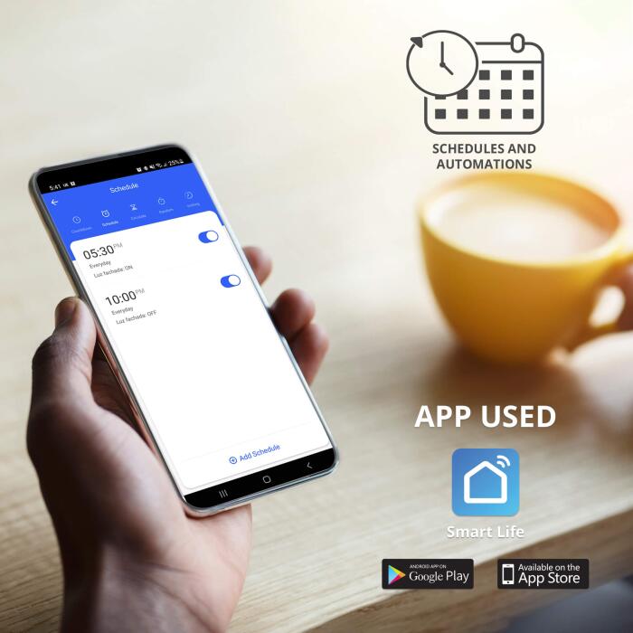 - Control total desde el teléfono: encendé, apagá y programá horarios desde la app Smart Life (iOS/Android).